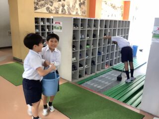 本校では、清掃を縦割り班で行っています。先日行った「秋を楽しむ体験学習」も縦割り班で行いました。一緒に秋の呉羽山を散策し、遊んだり、お弁当を食べたりして交流を深めたことが縦割り清掃でも生かされている様子が見られました。班の仲間と協力してバケツを運ぶ、拭き掃除を行うなど、学びが日常の活動にも生かされています。〈令和8年度入学児童募集要項及び願書等のダウンロードについて〉