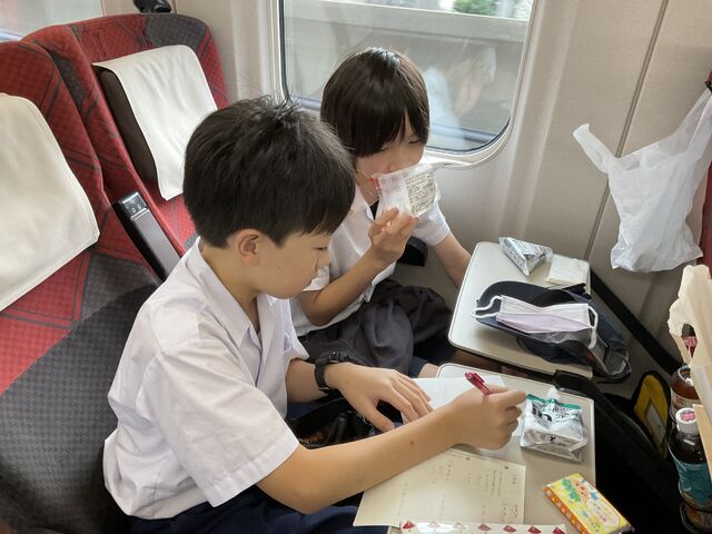 6年生は今日から修学旅行に出かけます。大阪・広島・奈良とそれぞれの学習のテーマをもって学んできます。 朝、早くから新幹線で移動していますが全員元気に出発できました。 新幹線では、朝食をとり、これからの活動に備えます。