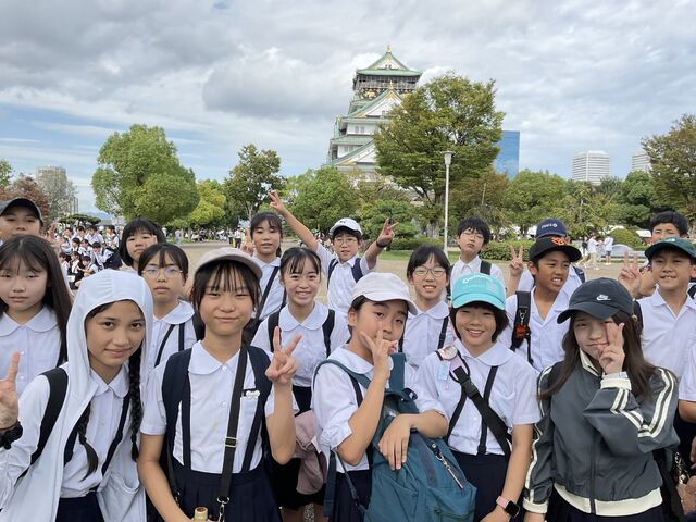 修学旅行1日目の午後は、大阪城を見学しました。 天候にも恵まれ、雨があがった大阪城の天守や豊臣秀吉ゆかりの物に目を丸くしながら、見学していました。
