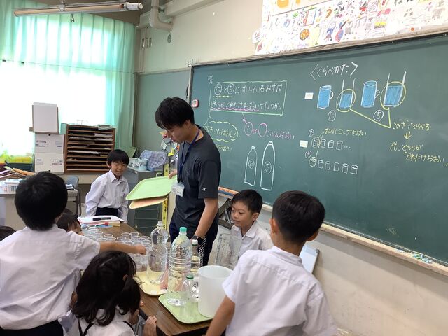 1年生の算数科「どっちが多い」では、ペットボトルの水をどちらがどれだけ多いか考えました。紙コップを使えば、どちらが多いか分かると考えて試しました。