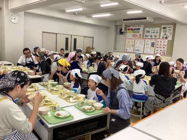 1年生の給食試食会を行いました。最初に家庭科室で、栄養教諭から保護者のみなさまに「食」が子供の健やかな成長に関わることを説明しました。その後、保護者と子供と一緒に給食を味わいました。おいしい給食に大人も子供も笑顔になっていました。