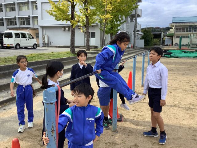 2組の第7回目のなかま活動が行われました。 活動を積み重ねると、各なかま活動で行う遊びも幅広くなってきました。 1年生が鉄棒で技を披露すると「すごいね、もう1回できる?」と、出来たことを認め合う関係性が見られました。