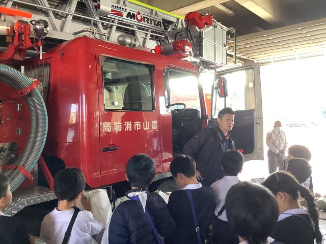3年生が、富山市消防局へ社会科見学に出かけました。子供たちは、これまでの学習で生まれた「署の方への質問」をバインダーに挟み、わくわくした表情で消防署内外を見学しました。