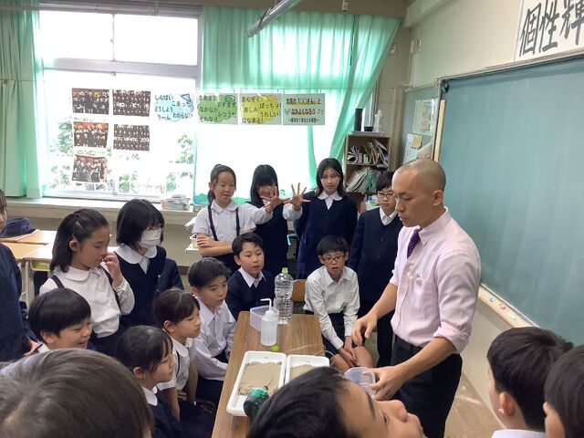 5年生は理科で流れる水の働きについて学習しています。この日は川の流れが分かる実験道具で流れる様子を確認しました。附属小学校の近くには、神通川という大きな河川が流れています。普段見ている川がどのような動きをするのか、子供は興味津々で教師の実験する様子を見ていました。
