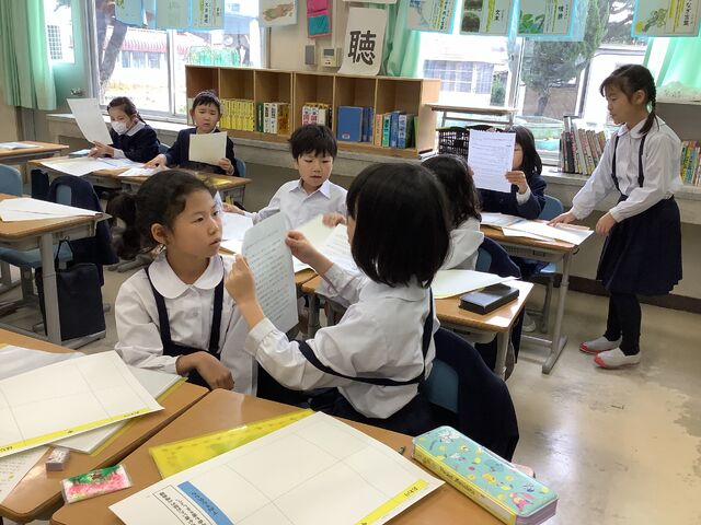 2年生の国語科「お話のさくしゃになろう」では、はじめ・なか・おわりの文章の構成に気を付けて自分の創造したお話をつくっています。この日は、友達と自分の作成途中の文章を互いに確認しました。完成までは、まだまだ道半ばです。22日に行われる教育研究発表会では、互いの文章がよりよいものになるように話し合う子供たちの姿を見ていただきます。お楽しみください。