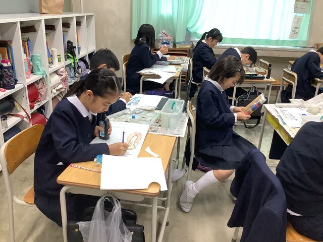 5年生は図画工作科「わたしのくつ」で、自分の思い入れのある靴を絵に表しています。 自分の靴に合った詩やオリジナルの判も絵の中に表し、素敵な作品に仕上がりました。