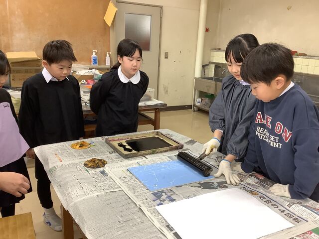 3年生は、初めて彫刻刀を使って作品に取り組みました。 自分の好きな生き物をテーマに作品を製作しました。 刷るときには、きれいに色が出るかドキドキしながら活動を進めていました。